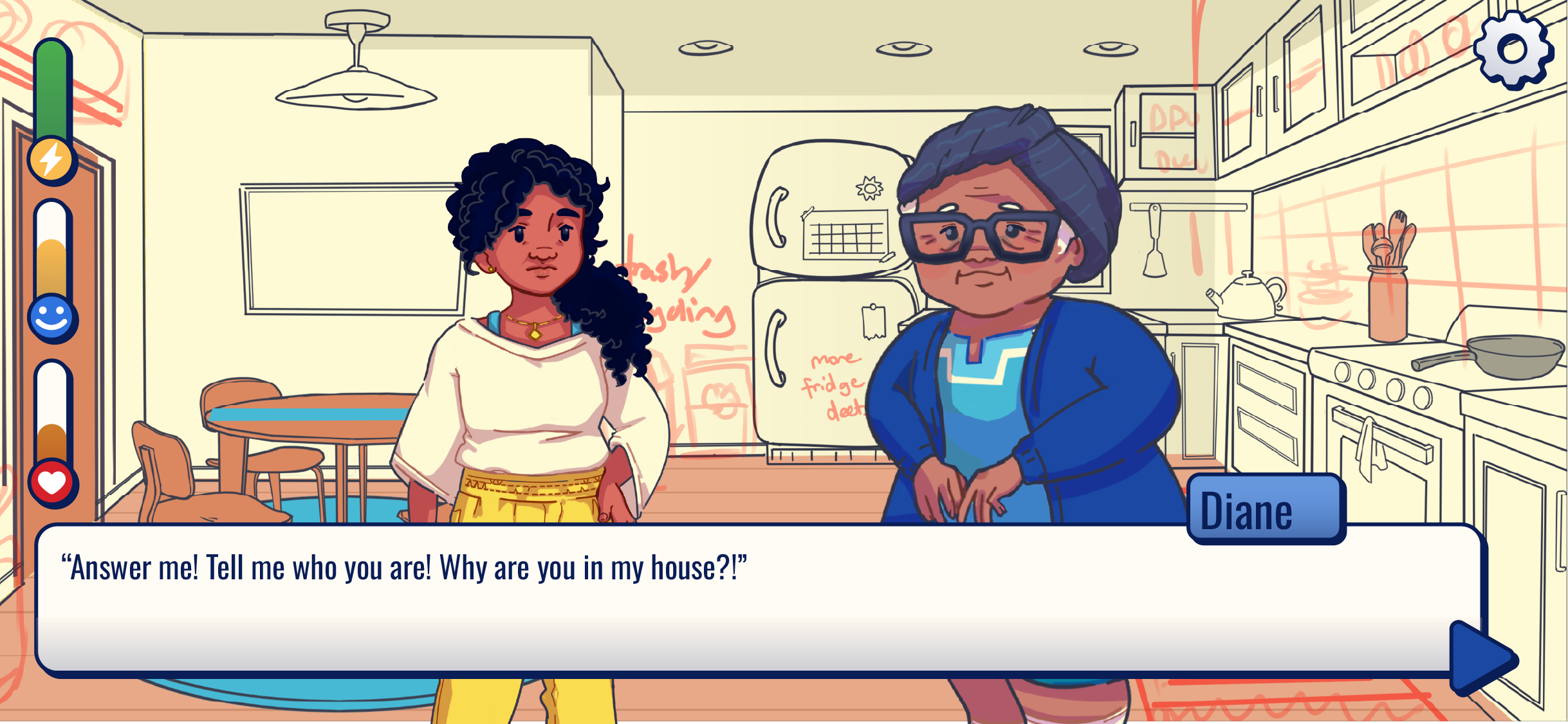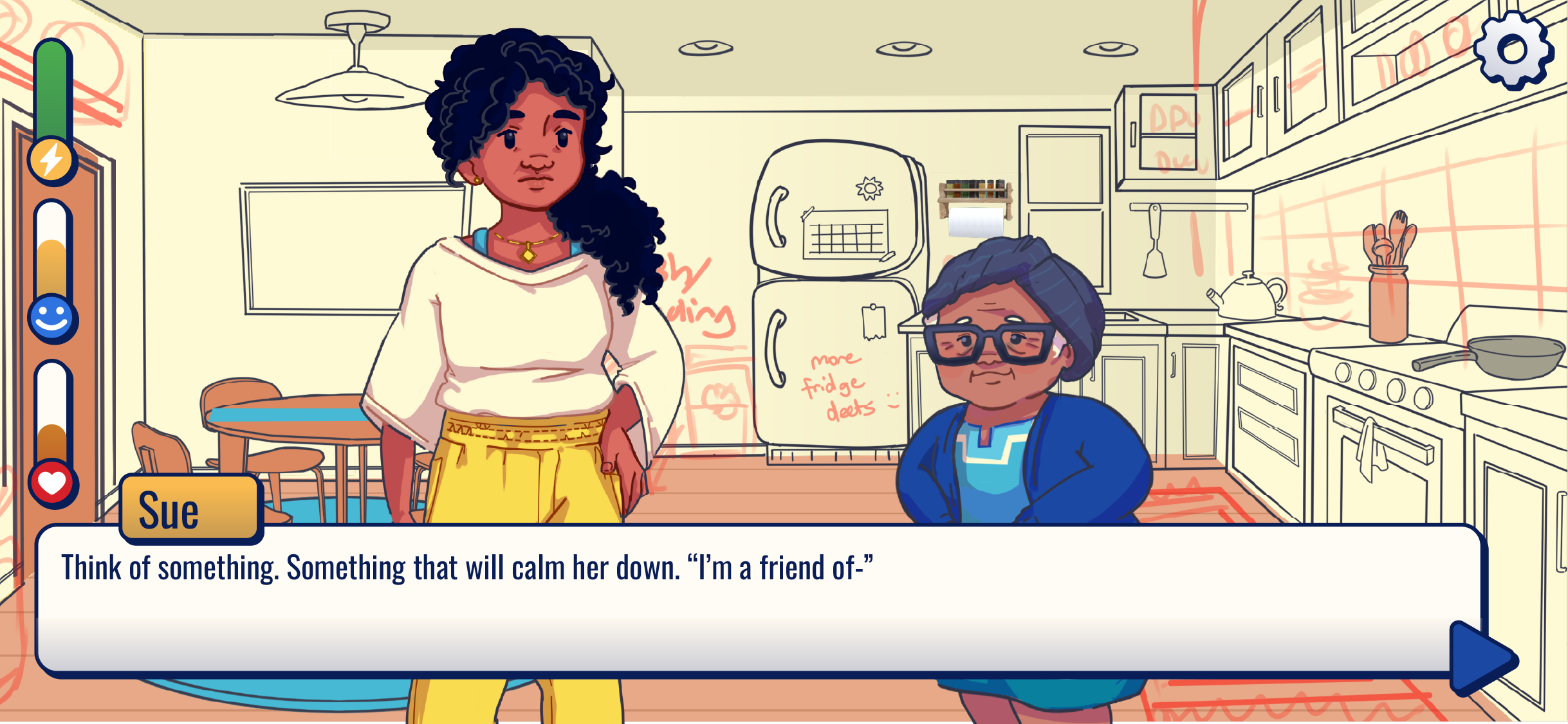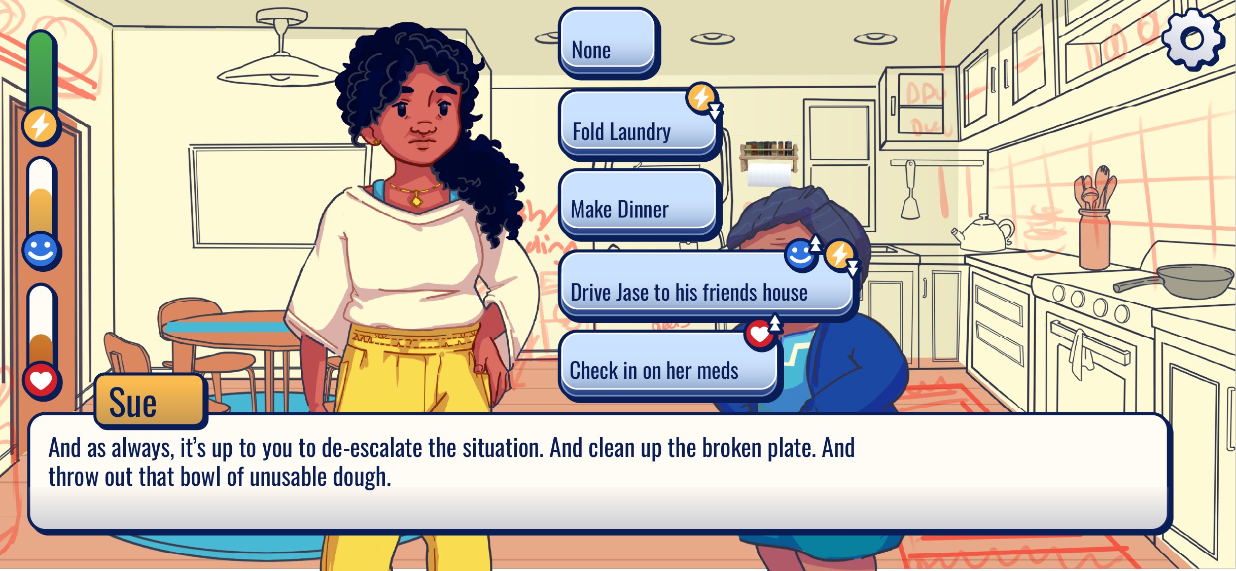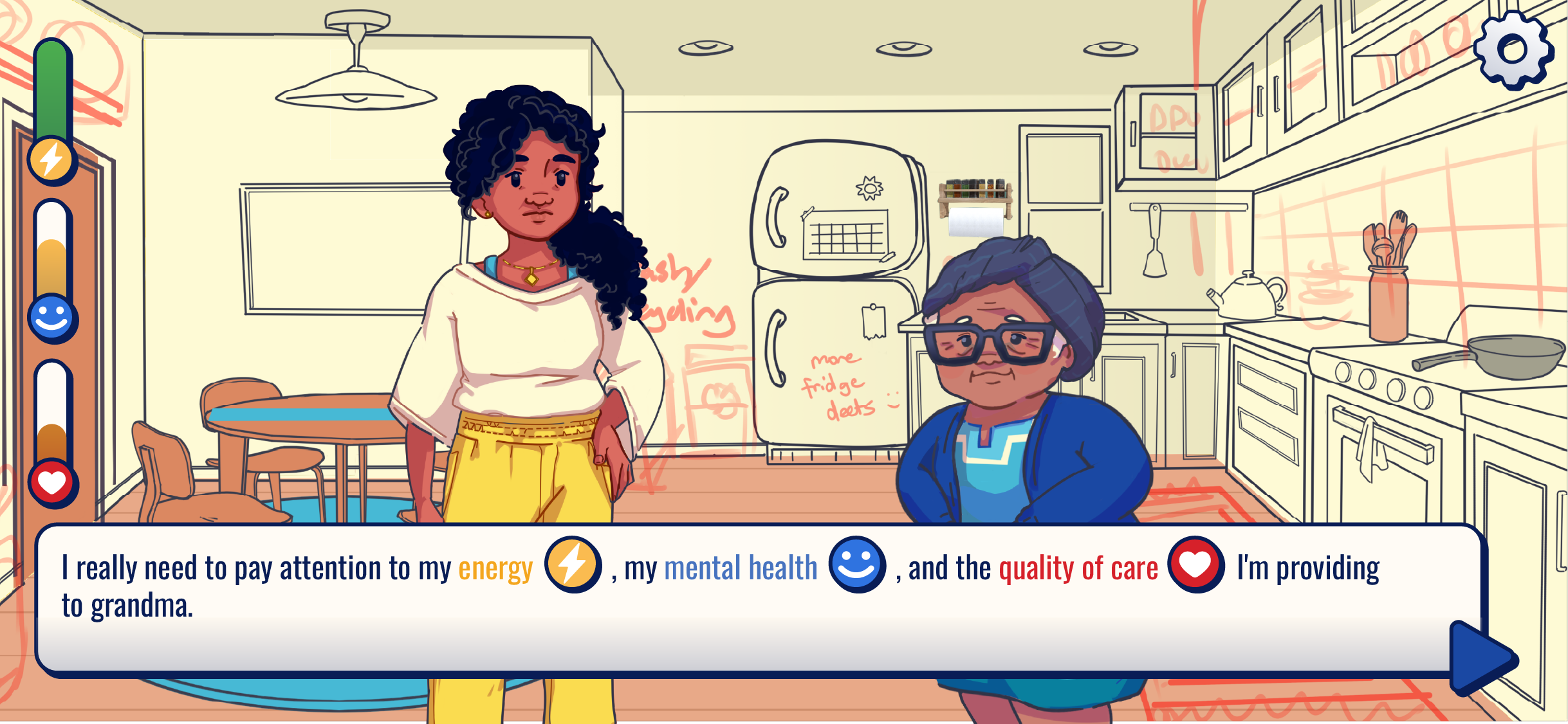 The game is being developed in stages, starting with a “vertical slice” focusing on a single story. Specific player choices and behaviors are logged for research purposes by the University of Kentucky College of Pharmacy to help understand caregiving dynamics better.